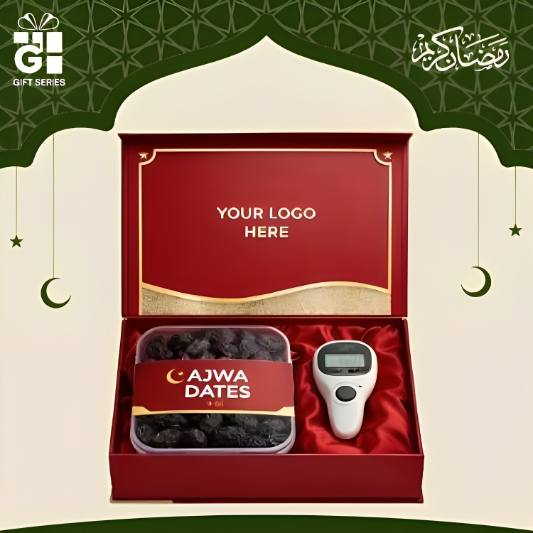 A luxurious Ramzan corporate gift featuring 1 kg premium Ajwa dates paired with a digital tasbeeh, elegantly presented in a rich red box for meaningful and refined gifting.